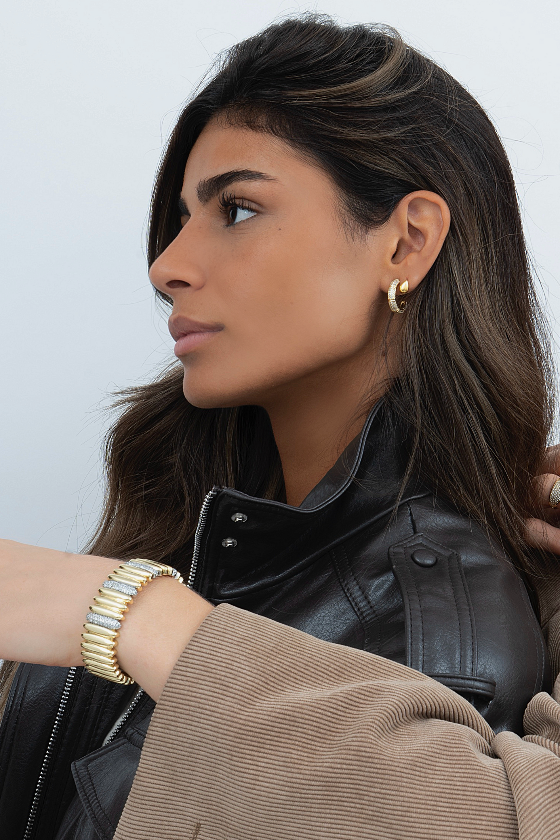 C’est une boucle d’oreille dorée en forme de créole épaisse, ornée de pavés de petites pierres étincelantes sur toute sa surface