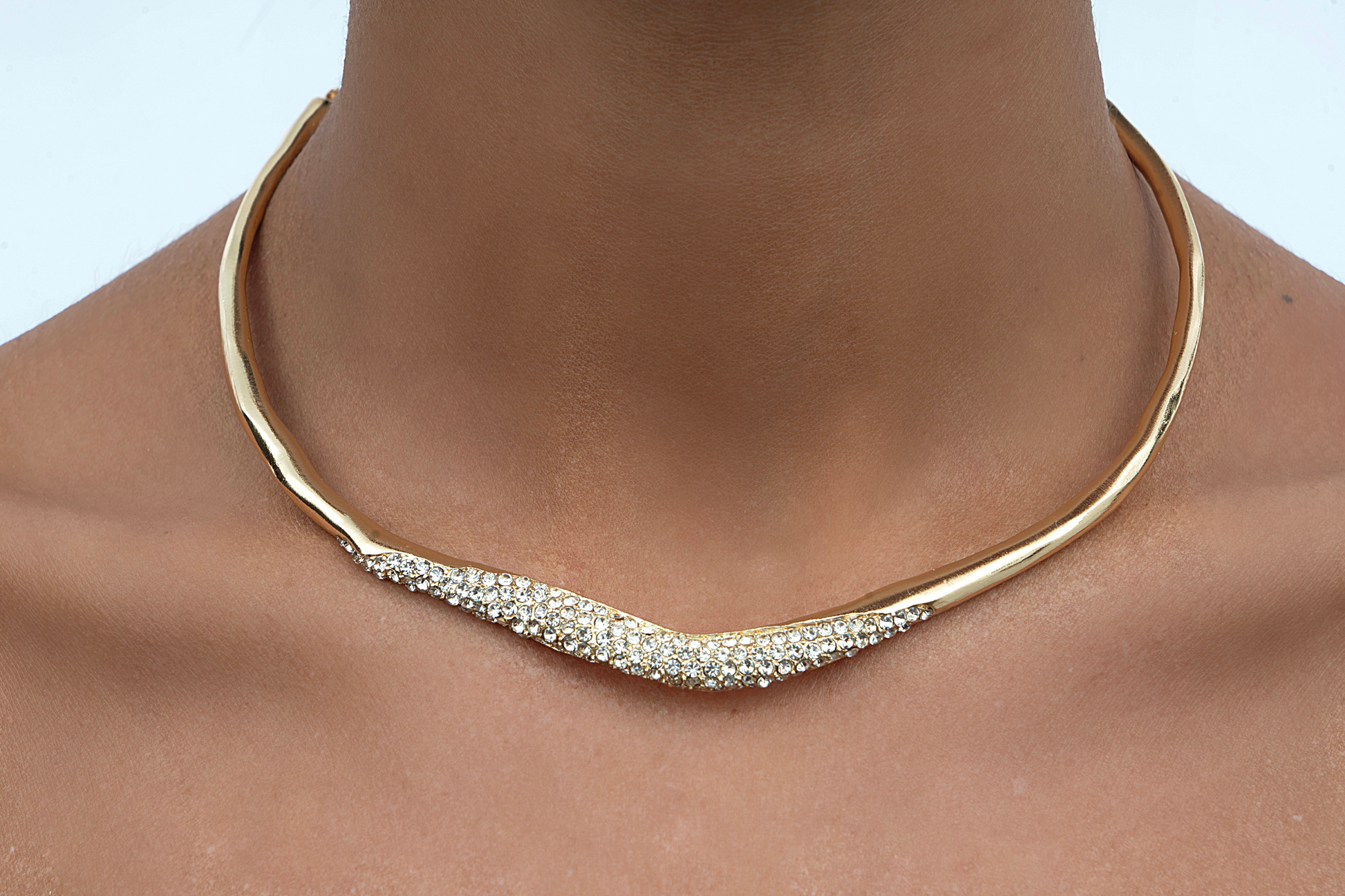 C’est un collier rigide doré au design moderne, avec une ligne fluide légèrement torsadée au centre, rehaussée d’un pavage de pierres scintillantes qui apporte éclat et élégance.