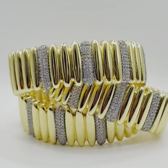 C’est un bracelet jonc ouvert doré, composé de maillons ovales bombés, dont certains sont pavés de petites pierres scintillantes argentées, créant un contraste élégant et sophistiqué.